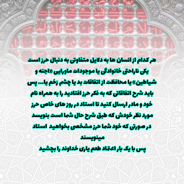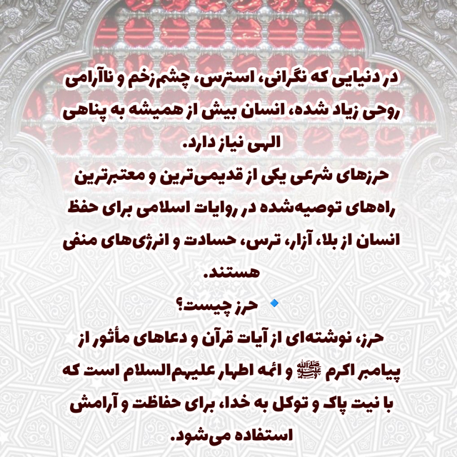 حرز، نوشتهای از آیات قرآن و دعاهای مأثور از پیامبر اکرم ﷺ و ائمه اطهار علیهمالسلام است که با نیت پاک و توکل به خدا، برای حفاظت و آرامش استفاده میشود.